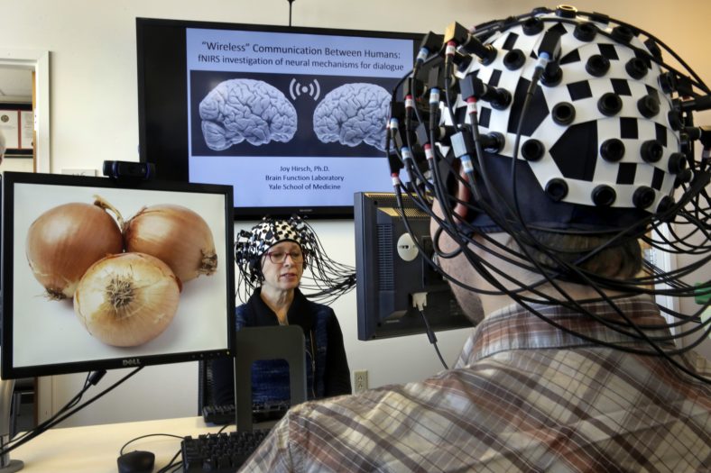 Shaw Bronner, left, and Shaul Yahil, two researchers at the Yale Brain Function Lab, describe images on their computer screens to each other while their brain activity is mapped during a demonstration of the technology in New Haven, Conn. on Friday, March 13, 2015. At one end of each of the 64 fiber optic cables in each headpiece, weak laser beams saw about an inch into their brains to detect blood flow. (AP Photo/Richard Drew)
