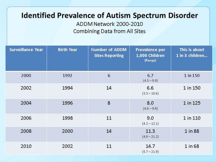 هم اکنون از هر ۶۸ کودک در آمریکا یکی با اختلالات طیف اوتیسم زندگی می کند. این نسبت در میان پسران یک به ۴۲ است