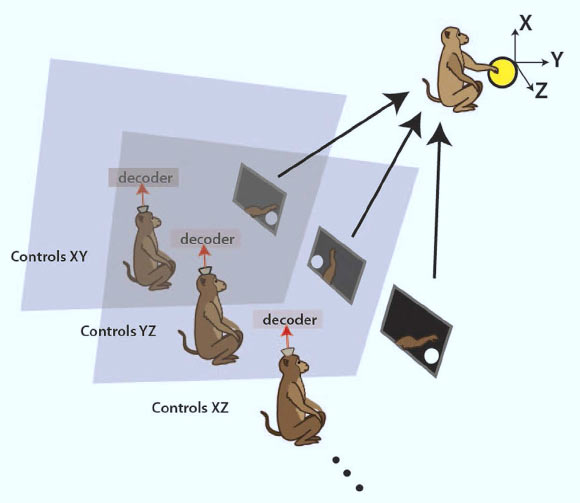 آنها برای این منظور مغز سه میمون را به رایانه ای متصل کردند که تصویر متحرک بازوی روباتیکی را کنترل می کند.
