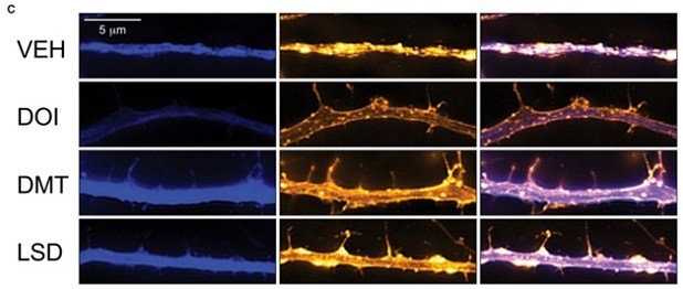 در این تصویر، veh گروه کنترل، DOI کلاس مواد آمفتامینی، DMT کلاس مواد تریپتامین و LSD از دسته ی ergolines است. به راحتی می توان در تصویر مشاهده کرد که هر ماده تا چه اندازه در افزایش و بهبود اتصالات موثر بوده است.