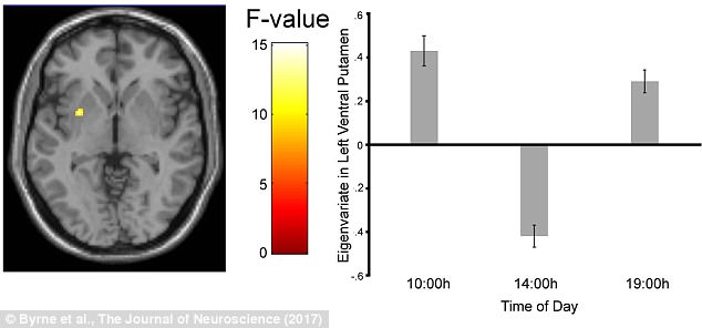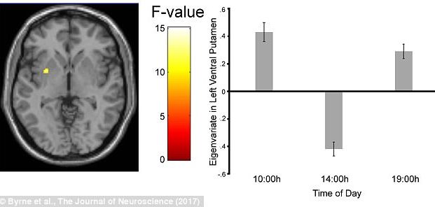 کارشناسان در این تحقیق با بررسی اسکن مغزی داوطلبان مرد در ساعتهای مختلف روز دریافتند فعالیت منطقه پوتامن مغزی که با بخش پاداش دهی در ارتباط است در ساعات بعد از ظهر افت عملکردی پیدا میکند.